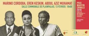 Abdul Aziz Muhamat, aka QNK002, is a Sudanese refugee currently interned by the Australians on Manus Island detention centre in Papua New Guinea. Standing left, here is at the MEA Award ceremony in Geneva in February, 2019. Arnold Tsunga, right, is a Zimbabwean lawyer and 2006 laureate in 2006 and currently an MEA Board member.